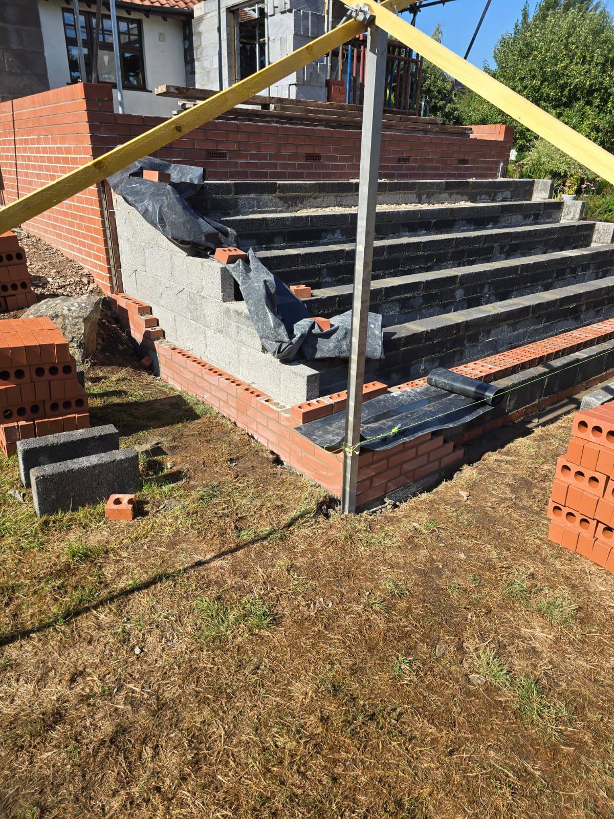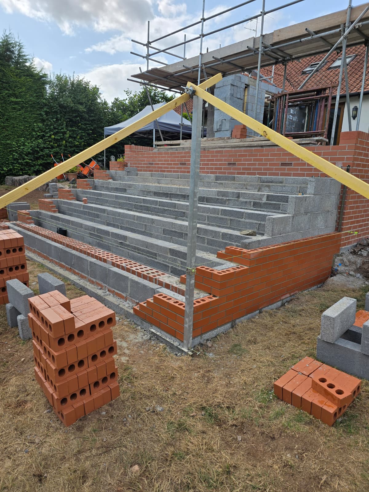Erection of insulated cavity walls, powder‑coated steel lintels over new openings and preparation for roofing, joinery and internal fit‑out.